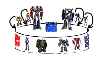 Основная идея торта: Автоботы против Десептиконов. Темные против светлых. Наверху торта фигурки Мегатрона и Оптимуса прайма в боевых стойках. Битва происходит на поверхности Луны. Ну и кристаллы - по количеству лет Именинника. Свечку решили не ставить и поздравительную надпись не делать.