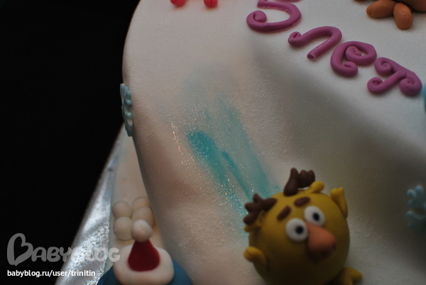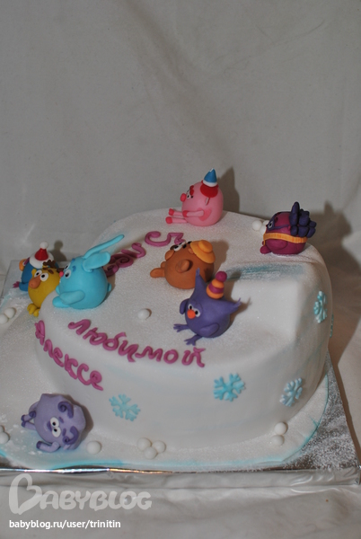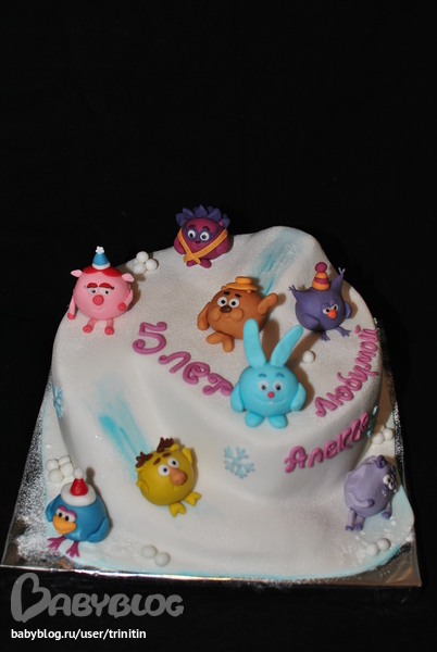 К смешарикам пришла зима (и это очень хорошо, так как изначально опять просили чаяпитие). Переливающаяся снежная поляна, ледянные горки, снежки и сияющие снежинки. Все это 2,7 кг. Ванильный бисквит, взбитые сливки с вареной сгущенкой, вишня и банан