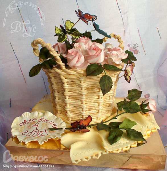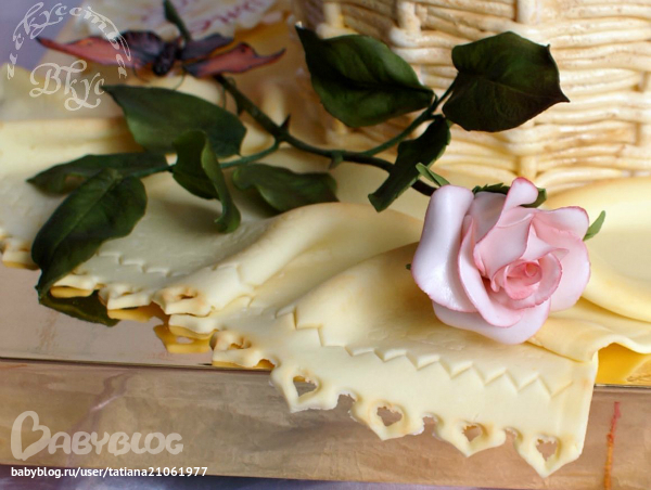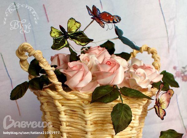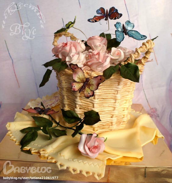 ))) Сам торт сначала собирался в виде коржей с кремом, потом остывал и пропитывался в холодильнике несколько часов, потом вырезался в виде корзины расходящейся кверху,  и уже с 5 вечера до 2х ночи был окончательно завершён( плетение, покраска, салфетка, размещение бабочек и цветов). А розы, листья и бабочки в течении недели готовились урывками)))
