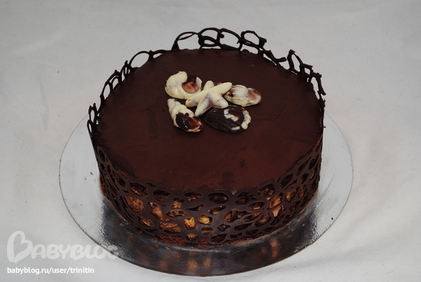 Продолжая эксперименты с шоколадом - торт обернут кружевной шоколадной лентой и сверху украшен шоколадными конфетками из белого и темного шоколада