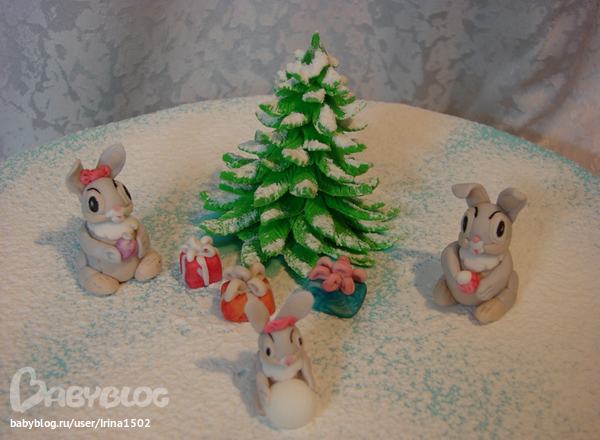 Очень захотелось попробовать слепить для нашего новогоднего тортика зайчат, ну и конечно же ёлочку, и вот что получилось...
