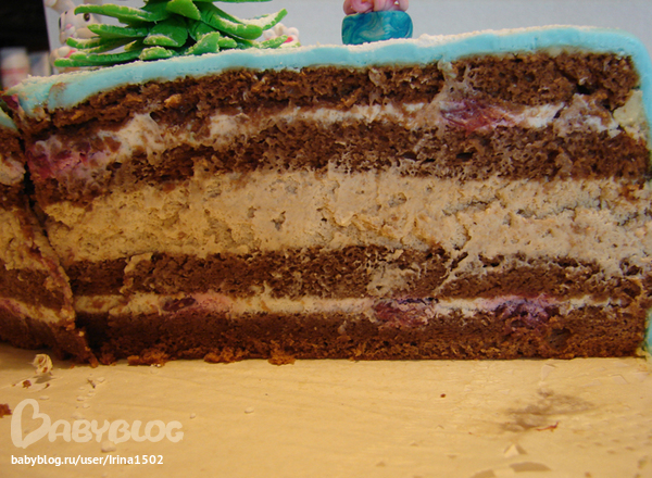 Шоколадный шифоновый бисквит, сметанный крем с вишней, вишнево-ромовая пропитка и вишнево- карамельное суфле. Взвесить забыли, диаметр 26 см, высота 8 см.