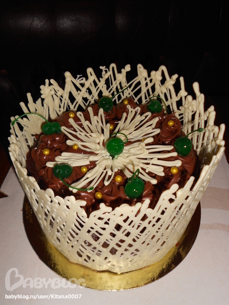 и этим же вечером в подарок для свекрови на др,бисквит и крем такие же(она тоже любитель всего шоколадного,так что удачно совпало)только без вишни,пропитка вишневый и шоколадный сироп и бейлиз,первый раз попробовала сделать шоколенту,фоткать не умею,поэтому смотрится как корона))