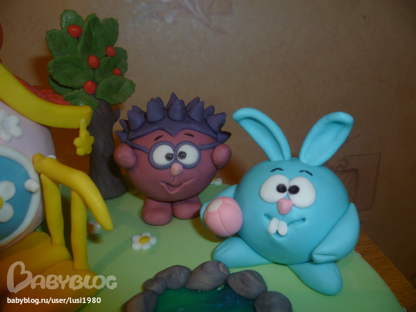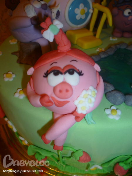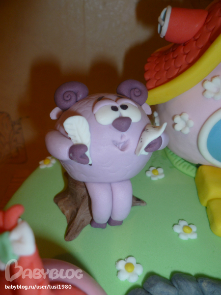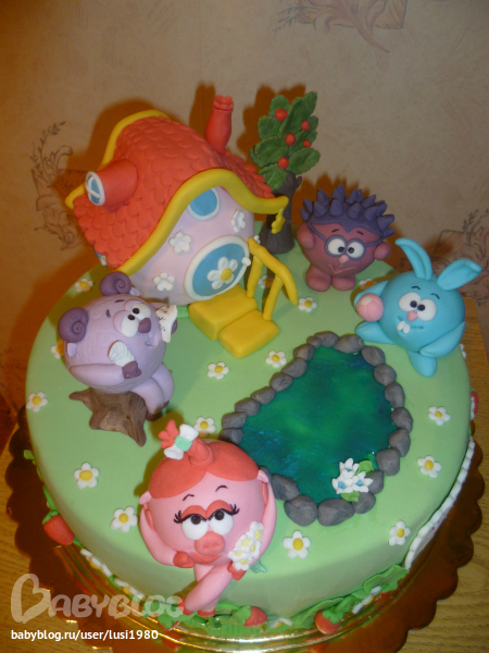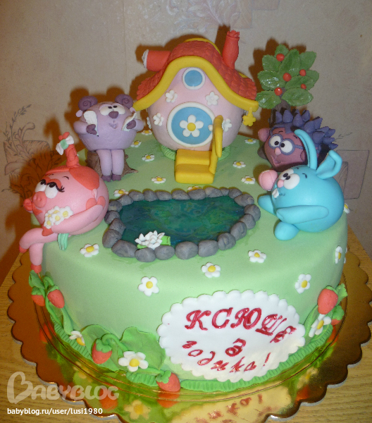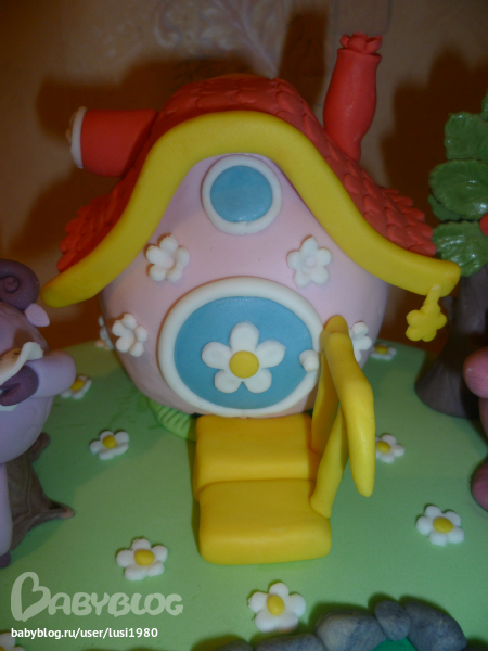Внутри ванильный бисквит на кипятке, сливочно-творожный крем, персики, ананасы. В домике бисквитная крошка, слив.масло, сгущёнка, грец.орехи.