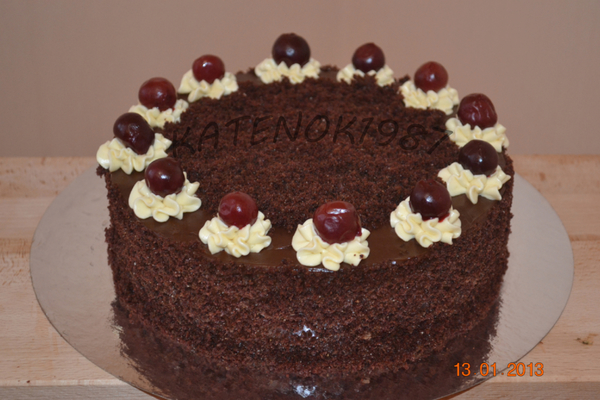:) классичский рецепт пьяной вишни))шоколадный бисквит, масляный крем со сгущенкой, а вишня вымочена в коньяке. но очень вкусно)) т.к. крем идет не слоями, а перемешан с бисквитом (ну кароче как в классическом рецепте):))