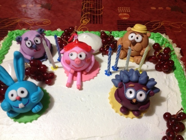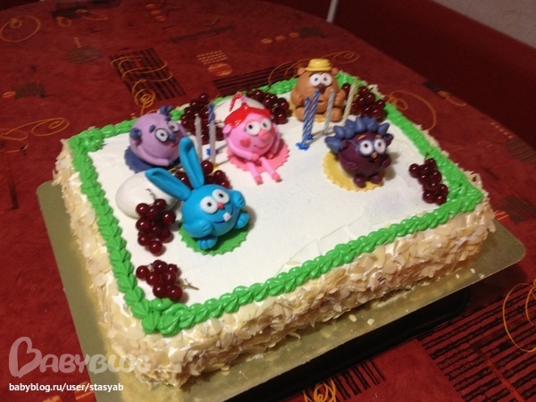 Торты детскиеЭто мой первый не мастичный торт, заказчики, просили смешариков и чтобы был не покрыт мастикой, вроде бы мастичные торты сложнее, но поскольку я делаю их постоянно, с обычным поломала голову) .Сверху покрывала вилтоновским масляным айсингом, очень понравился, и по вкусу (нежный и не слишком приторный) и в работе удобен. В коробке сухая смесь с приятным ванильным ароматом, в которую надо добавить сливочное масло и молоко, взбить миксером и готово! Приобрела его на всякий случай, когда закупалась в belkaonline.ru всяким инвентарем, вот и пригодился.