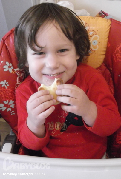 Достала я продукты, включила духовку, вынула формы для выпечки и тут, сынка понял, что сейчас будет весело. Помогал он от души, и яйца взбивать и муку добавлять и формочки наполнять. Жаль, фото процесса сделать не вышло, но на фотоаппарат рук уже просто не хватило)).