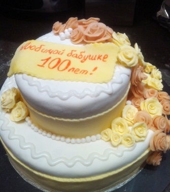 Проба пераа вот после первой моей "Свинки" получила первый заказ, т.е. второй мой торт )))! и надо же какой !!! Бабушке на 100летний юбилей!!! Отвтетственность большая! Я ещё со собственоручно сделанной мастикой пронервничала.