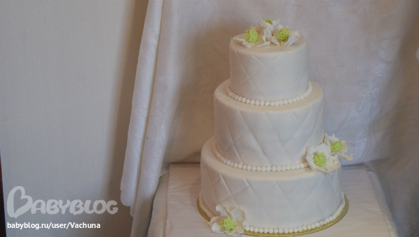 Нежный тортик! Только не понятно, второй ярус понят немного или это пузыри на мастике?