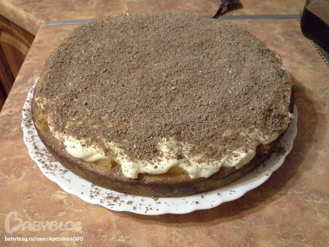 Все оч просто!!! Бисквит 3 яйца, 150 муки, 150 сахара, пропитала сиропом от персиков и плотный слой персиков положила, крем 250 сливок 33% 250 маскарпоне и 150 сахара. Сверху тертый шоколад ))))))