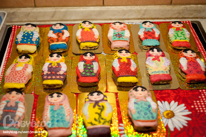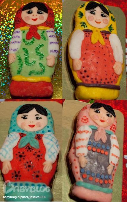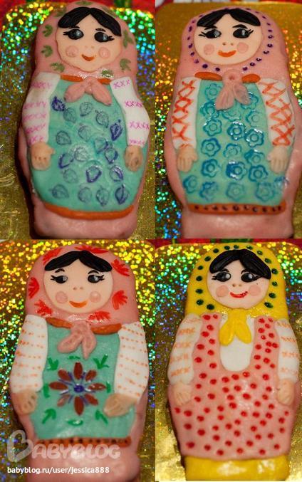 Печенье,пирожные,конфеты, выпечкаНужно было оформить печенье из пряничного теста в виде Матрешек.