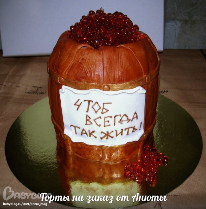Отличная бочка! Я тоже один раз делала. А вот икра которая в масло метается у меня не получилась,вся растаяла прям в масле. Делала по другому.. Выдавила желе из шприца на торт. Правда она очень меленькая получилась, но выглядела отлично.