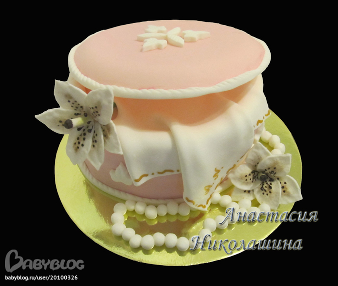 Торты для женщинЭтот тортик попросила сделать мама в подарок коллегам к 8 марта. Не обошлось без приключений:))) Сначала планировалось, что торт мама заберет в среду и я с чистой совестью не спеша рассчитала окончательно собрать торт в ночь вторника, а вчера только напечь коржи и слепить бусы. Но мама "обрадовала", что торт ей уже нужен во вторник вечером и мне вчера пришлось в спешном порядке и печь, и собирать. Как назло сына капризил и просился к маме. Хорошо, что крышка и лилии были готовы заранее:) Думала, что не справлюсь, но оказалось, что глаза боятся, а руки делают и делают уже достаточно быстро:)