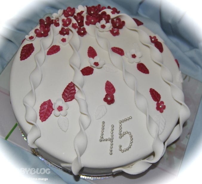 вот такой тортик мне заказала моя соседка своей начальнице а юбилей.Апельсиновый бисквит,творожно йогуртное суфле,персики.3200 вес.