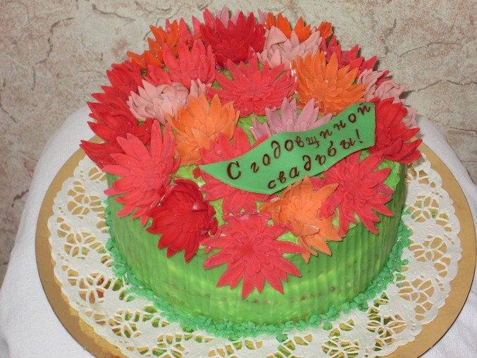 Торты юбилейныеГерберы очень красивые, яркие и "долгоиграющие" цветы, так пусть и у супругов жизнь будет такой же))) 14-ти летие у них)))) Цветы-надпись мастика, "стебли" цветов крем
