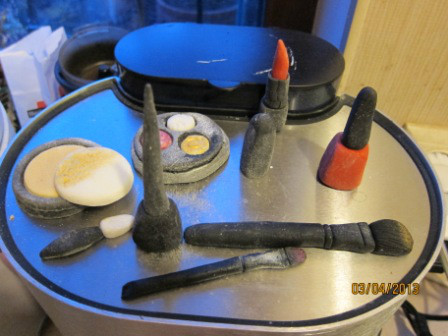 ВОПРОСЫ кондитеровДевочки, огромная просьба, что-то у меня с фантазией плохо стало. Помогите подобрать тортик, вернее, я сделала заготовочки, а как их теперь можно скомпановать? Как украсить сам торт. Думала обувную коробочку, но тогда косметика вроде как ни к чему! Не обращайте внимания на заготовки, плиз, т.к. они еще не покрыты ничем, а туфли вообще не закончены! :((( Тортик девушке на 25 лет.