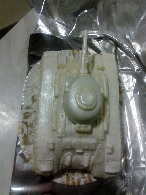 Этот танк был у меня первым (машинка 3, но танк 1) :) Это он у меня в зимнем комуфляже. Внутри шоколадный бисквит с заварным кремом и бананами.