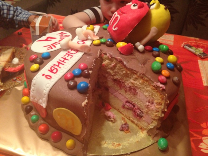 Проба пераА это мой первый заказной торт. внутри больших M&M's конфет пирожное "картошка". начинка торта ванильный шифоновый бисквит и сливочно творожное суфле с вишней и клубникой. вес 4 кг.