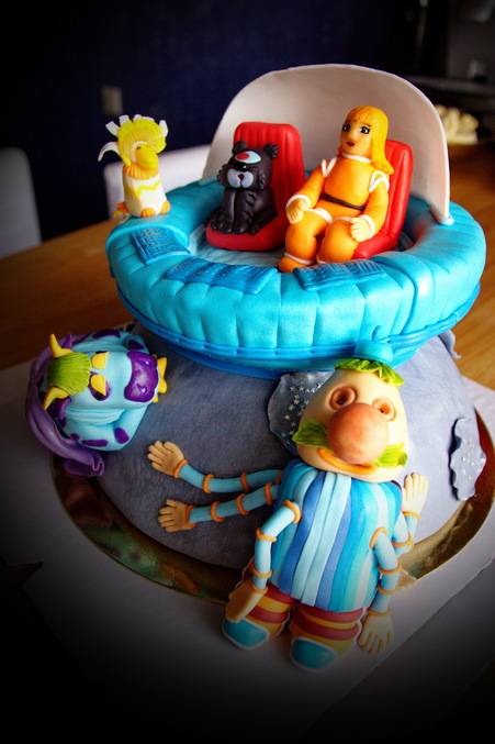 Олеся, замечательный торт! Действительно, выделяется из ряда лунтиков и маш ( хотя я к ним с симпатией отношусь ). Герои очень узнаваемые, исполнение корабля космического интересное! Просто умница!!!!!!!