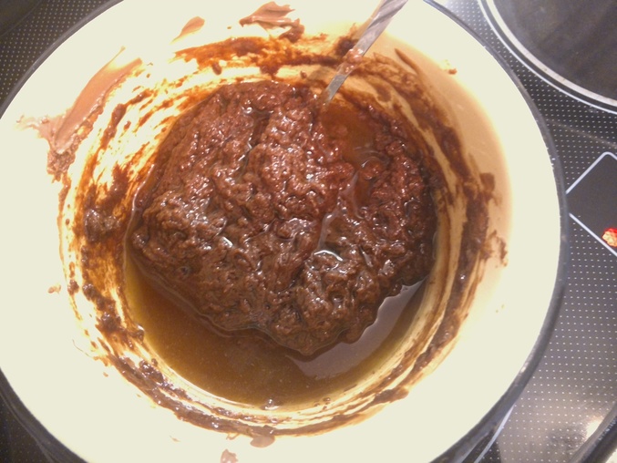 Причем с самого начала.....Растопила шоколад, добавила желатин, замоченный в сливках и ФСЕ! все превратилось в комок непойми чего...плюс еще и расслоилось на воду и непонятную клейкую массу. ФИга! Нас не испугаешь. Эту порцию в ведро, замешиваю новую. Опять топлю шоколад, и капаю туда чууууточку сливок (ганаш же делаю так, и все всегда путем) и снова ЗДРАСЬТЕ!!! Опять комок, только уже какой то сухой. Блиииииииннн.... Фсе. Сегодня больше не буду экспериментировать.