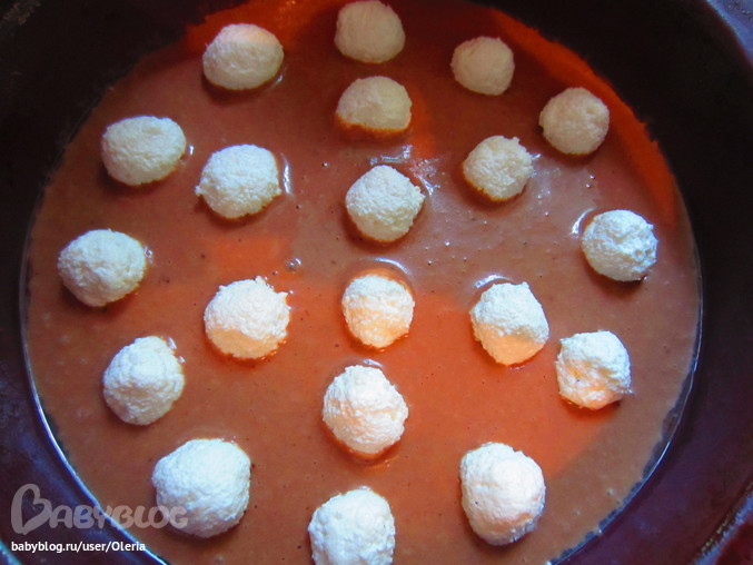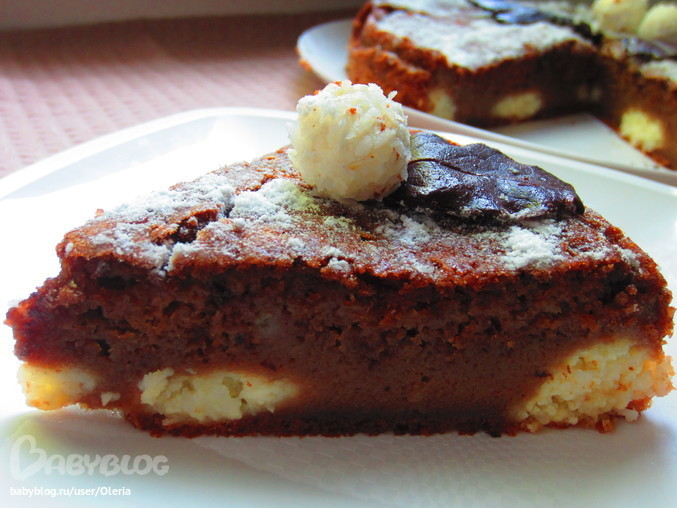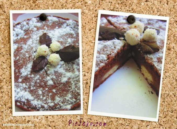 В разьемную форму, застелянную бумагой для выпечки, или силиконовую, вылить половину теста, положить шарики как на фото, и вылить аккуратно оставшееся тесто. Запекать при 180 градусов 40 минут. После приготовления, еще горячий торт залить пропиткой. Я промазываю кисточкой, что бы равномерно и не переборьщить. Дать торту остынуть и украсить по желанию. У меня сахарная пудра, шоколадные листики( намазала шоколадом листья розы и положила в морозилку.) и шарики творожные в кокосовой стружке.