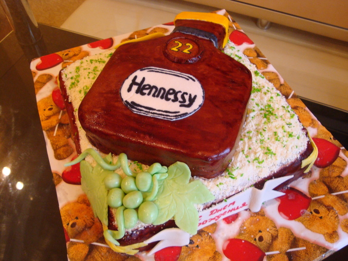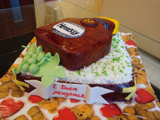 Бутылка - худший торт из представленных. Он не похож на бутылку. Нужно было придавать ему именно форму бутылки, нещадно срезая все лишнее. Ты видела бутылку хеннесси? Она округлая, на ней виноградные листья, гроздья, лоза... А у тебя только наклейка "хеннесси", по которой можно определить, что именно ты хотела сделать. Красила губкой? Если да - молодец, нашла выход. Вообще для таких работ используется аэрограф.