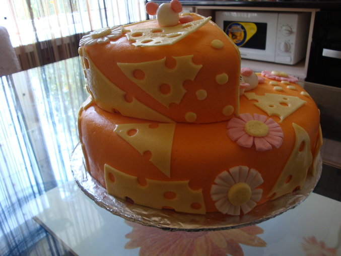 Мыши в сыре. Лучший торт и по цвету, и по композиции. Вероятно потому, что достаточно четко повторила торт-оригинал. Но зачем ты налепила цветочки???? Где ты на сыре цветочки видела? И дырки на сыре не накладные, а утопленные! Их нужно было стеком продавить в мастике.