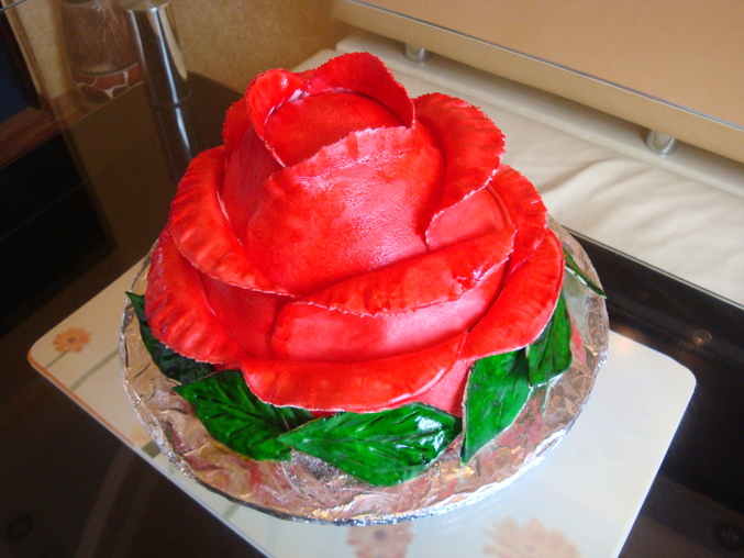 Роза. Суть правильна, но ты поскупилась на работу. Нужно было делать большее количество лепестков, было бы значительно более похоже. А так она у тебя больше похожа на красную капусту. И еще - в розе листики, которые обрамляют низ торта, должны торчать в стороны, а не обвивать розу как веночек.