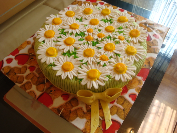 Оксана, торт с ромашками очень низкий. Такие пекли наши бабушки, но сейчас при современных технологиях сборки тортов такая форма не актуальна. Ромашки хорошенькие. Стебельки (полосочки на боках торта) делаются экструдером. То, как сделано у тебя - неаккуратно. Неаккуратность - худшее, что может быть на мастичном торте.