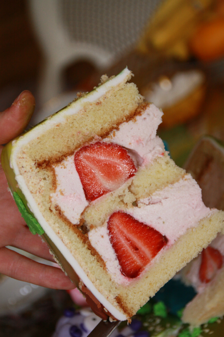 Внутри ванильный бисквит, сливочно-йогуртовое суфле с маскарпоне и клубничным пюре, и клубника конечно же.