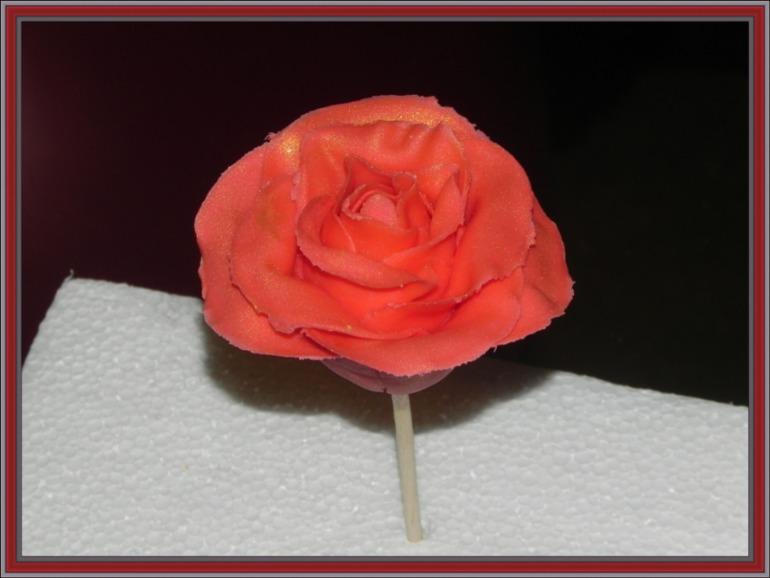 Спасибо, Ленусь))) После первой неудавшейся думала все, цветы не мое, но все смяла и опять давай лепить. Все-таки опыт и практика - великая вещь!! А теперь на вопросы отвечаю. Булька, как ты пишешь, из мастики. Из пенопласта надо уметь выпиливать, но для больших розочек учту))) Посадила на шпажку, сломанную пополам, а то они длинные очень (для мини-шашлычков такие продают, они потолще зубочистки). Не соскальзывает вроде. А вот мастика - остатки коллебаута и ты занешь, мне чего-то она намного больше модела нравится (может я конечно не поняла пока все прелести модела), но розочка высохла уже часа за два.