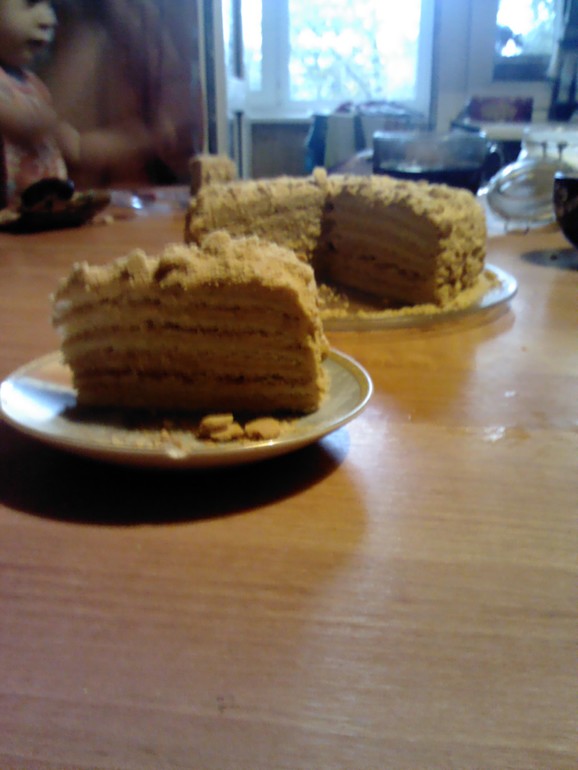 В общем не дождались мои пока пропитается, пришли пить чай. На вкус понравился, но тут нужно учитывать момент, мои очень любят сладкое. Со сметаной он все-таки полегче. А тут прям очень-очень сладко и очень-очень вкусно (ребенок прокомментировал), а муж на ДР такой себе заказал, чтобы на работу отнести. Фото в разрезе