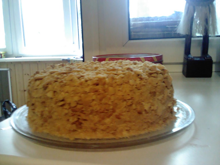Я сметану взбила с пудрой, получилась жидко, я ей пропитала, потом присыпала крошкой и сверху уже масло+ сгущенка. В не разрезанном виде получился вот такой, а по вкусу отпишусь, как мои попробуют. Сама не ем торты )))))