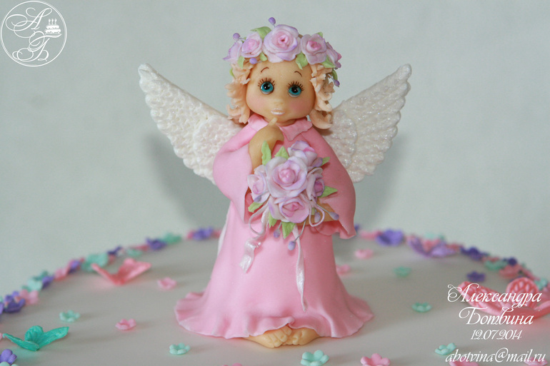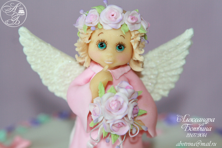 Основные цвета для оформления дня рождения были,розовый,сиреневый и мятный.Вот по этому фото я лепила ангелочка,считаю что с задачей справилась.