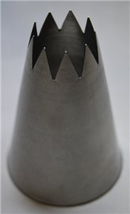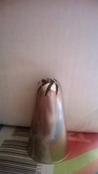 Привет, anami! Извини, не знаю имени. Именно такой насадкой такие красивые розы, как на фото торта и получаются.Не знаю правильного названия. В интернете написано так: предназначена для создания цветков с помощью закручивания при выдавливании материала. А то что на фото как корона с зубцами — это открытая роза и ею таких глубоких рельефных лепестков — надо очень постараться — что бы добиться.) У меня ею не получается. Она такой рельефный конус дает для капкейков.