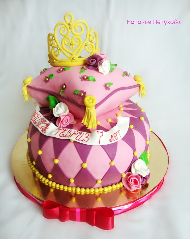Торты детскиеВес 3,2 кг. В нижнем ярусе медовик со сливками, в подушечке шоколадный бисквит, крем "пломбир". Пропорции мне не нравятся, в следующий раз буду внимательнее, но именинница была в восторге, а это главное. Дизайн всем известный, спасибо автору!)