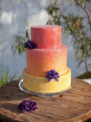 Наташа, привет. Такого эффекта можно добиться следующим образом. На уже окрашенную мастику (судя по цветовому переходу красили аэрографом) и подсохшую нанесен айсинг следующим образом. Делаем негустой айсинг и губочкой аккуратненько — макаем в айсинг и прикладываем к торту не сильно, слегка оставляя след и так весь тортик. В принципе, если аккуратно красить губкой — тоже можно добиться такого цветового градиента, растяжечки цвета из красного в желтый.