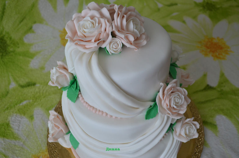 первый вечер пекла, второй собирала, выравнивала, утром 3 часа украшала (обтяжка, драпировка, цветочки по местам расставляла)...и совсем забыла про цветочки на нижний ярус..=(((расстроилась=(((