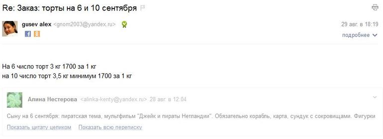 В результате - > торта нет. Кондитер удивлена, ничего я у нее не заказывала. Она вообще в больнице. Интернета у нее 10 дней как нет нет, ничего не писала ,ничего не подтверждала. Кто мог написать от ее имени - она не знает.