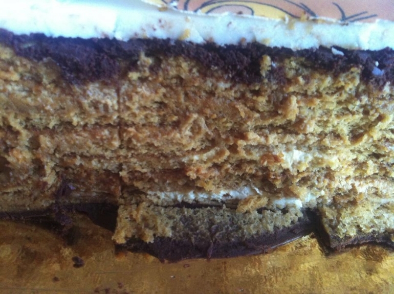 Не, Лен, медовик стандартный вот отсюдаА сверху и снизу обмазан шоколадным ганашем.Крем сметанный и сливки со сгущенкой.