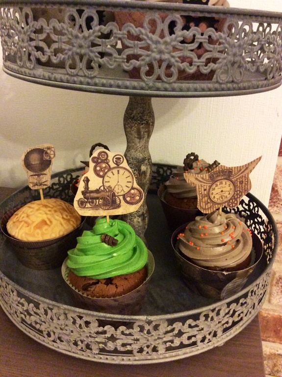 Шокаладные капкейки с кусочками молочного шоколада, апельсиновый курд, жидкий шоколад, сливочно-карамельный крем. Шапочки швейцарская меренга.
