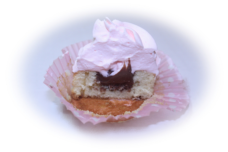 Капкейки сливочные с малиновым топпингом и шоколадной начинкой.