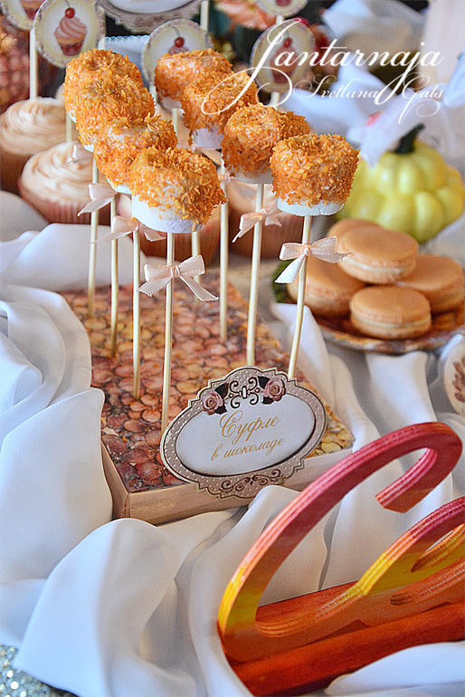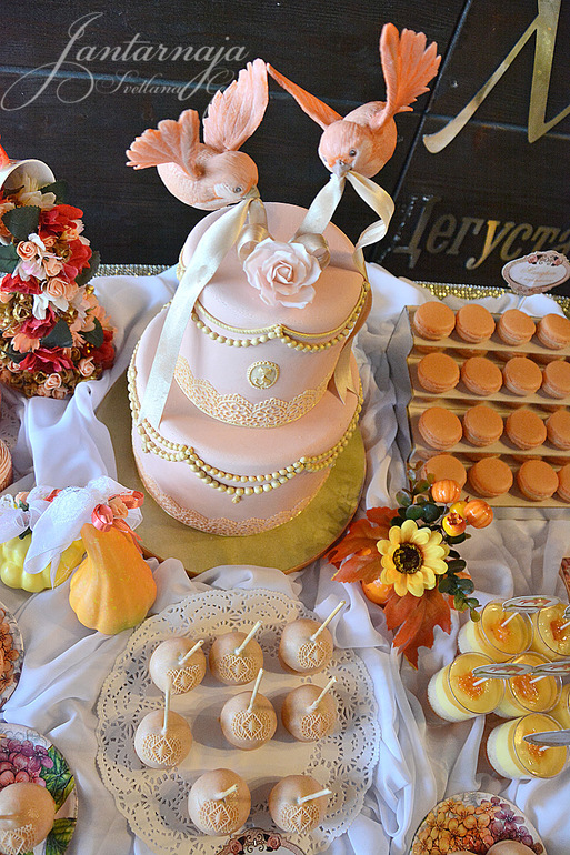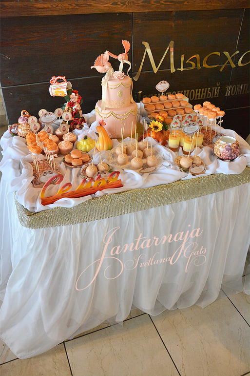 Так вот, приезжаю в кафе, и вижу, стоит, идеальный малюсенький, декорированный столик для торта. Не долго думая(посовещавшись с невестой, конечно), за 15 минут собрала сладкий стол. Весь декор, "своровала" со стола молодых, да и так по залу много мелочевки расставлено было, она тоже в ход пошла.