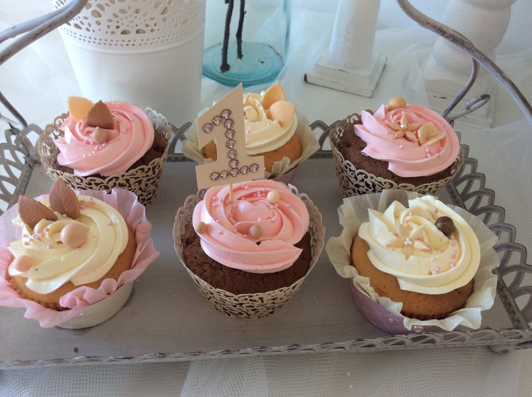 На столе ванильно-карамельный тортик 5 кг с жареными грецкими орешками, ванильные и шоколадные капкейки с лимонным и апельсиновым курдом и жидким шоколадом.