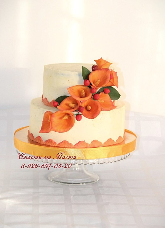 Торты свадебныеТорт кремовый!!!! Делала торт под букет невесты, а ей в последний день позвонили флористы и сказали что каллы белые будут, рыжих нет, а мне так рыжие понравились. В живую они симпотнее выглядят, на фото не так выглядят ( я даже не ожидала, что получится, т.к. не очень люблю эти цветы)