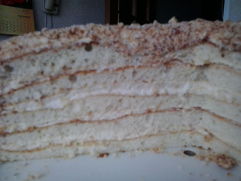 Очень мало крема и толстые коржики. Я делаю или взбитые сливки (классика), или творожно-сливочный, или сливочно-маскарпониевый крем. Со сгущенкой, конечно, сладко..