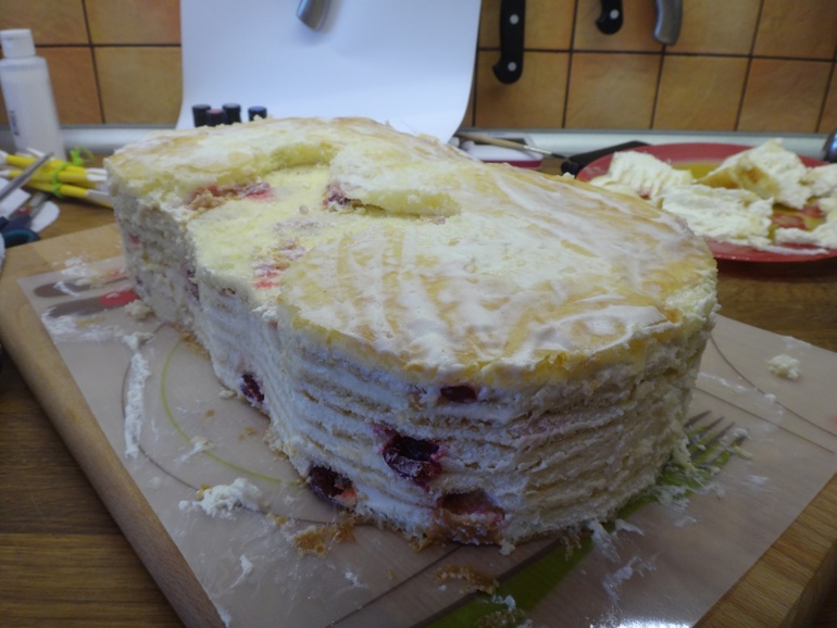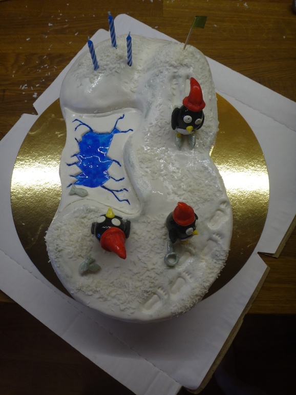Под мастику выравнивала масло+сгущенка+печенье. Горы и возвышенности из обрезков коржей. Только бок со стороны гор уехал уже после покрытия( И краска на пингвинах не высохла (красила жидкими красителями). А внутри получился очень вкусный.