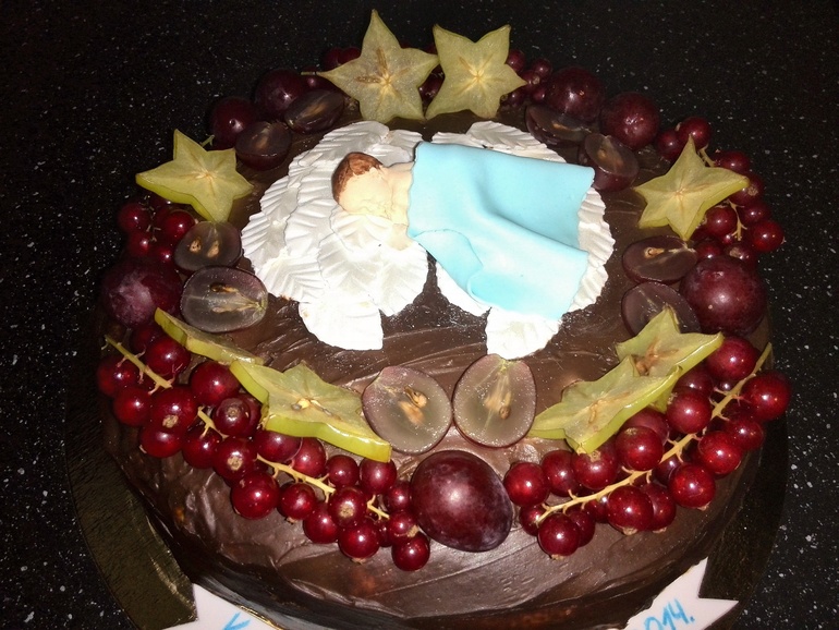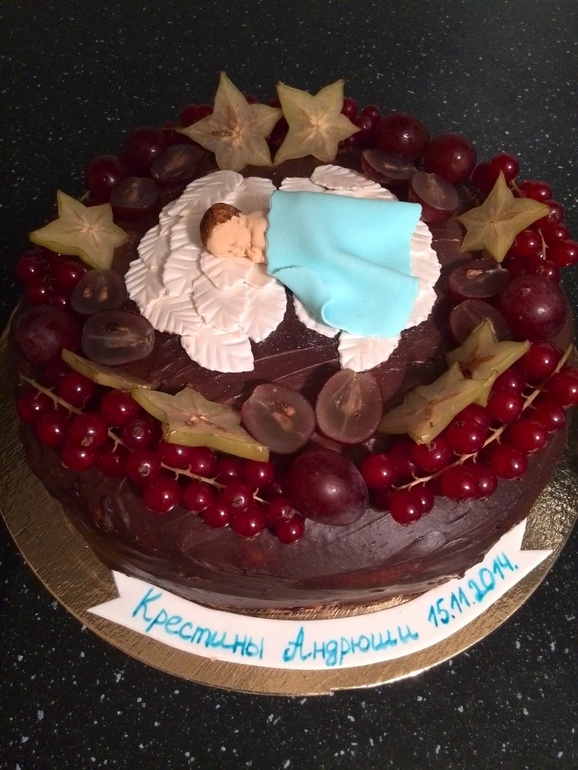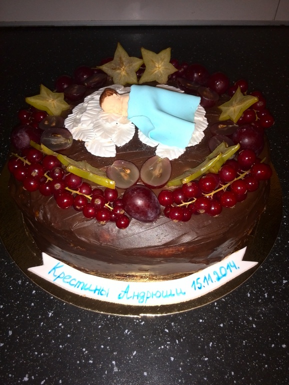 Полюбившаяся моим домашним Молочная девочка,крем маскарпоне с вишней,ганаш из темного шоколада, украшен ягодами и малыш из мастики. Вес 2,5 кг. Делала на крестины племянника. Фото под катом.