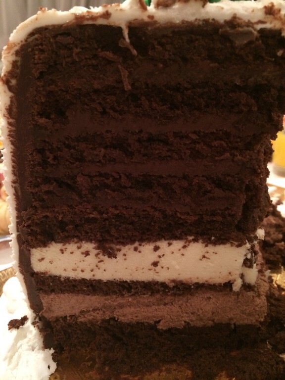Шоколадные шифоновые коржи, внизу сливочное и шоколадное суфле,сверху крем из шоколада и пралине, шоколадный ликер