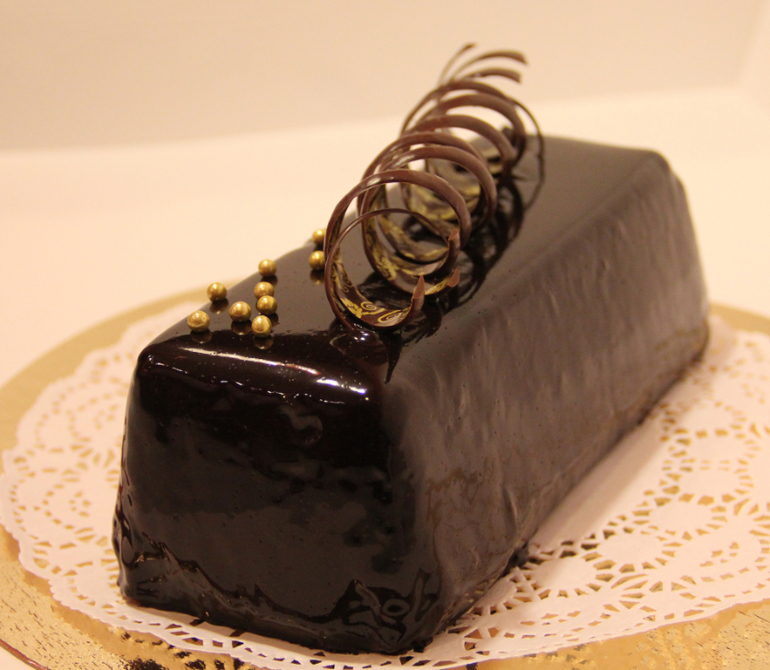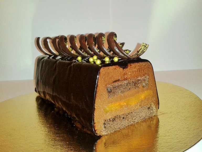 Шоколадный бисквит 3 яйца 75 гр сахара 60 гр муки 13 гр какао порошка 20 гр сливочного масла Шоколадный мусс 200 гр шоколада с содержанием какао более 40% 150 гр английского крема 240 мл сливок 33-35% 10 гр желатина Английский крем 90 мл молока 30 гр сахара 1/2 стручка ванили 30 гр яичного желтка Абрикосовый джем 40 гр кураги 5 гр сливочного масла 5гр сахара 40 гр лимонного сока 40 гр абрикосового варенья 5 гр набухшего желатина Зеркальная глазурь 30 гр воды 110 гр сливок 33% 140 сахара 50 гр какао порошка 5 гр желатина Декор шоколадные спиральки Для бисквита - желтки с половиной сахара взбть в пышный светлый крем. Белки взбить. Добавить сахар и взбивать до плотных пик. Аккуратно смешать желтки и белки. Всыпать муку, просеянную с какао, осторожно перемешать. Влить по краю растопленное сливочное масло, перемешать. Готовую массу вылить в форму (у меня силиконовая прямоугольная) и выпекать 20-25 мин. при 190 гр. Готовый бисквит остудить, перевернуть на решетку и выдержать 8 часов при комнатной температуре. Для джема - нарежьте курагу мелкими кубиками. Смешайте в кастрюльке порезаную курагу, сахар, сливочное масло, варенье и лимонный сок. Нагрейте смесь до жидкого состояния и добавьте набухший желатин. Остудите. Английский крем для шоколадного мусса - в кастрюльку налить молоко,добавить семена и сам стручок ванили. На среднем огне нагреть, не доводя до кипения. Взбить желтки с сахаром. Тоненькой струйкой влить желтки с сахаром в желтковую смесь. Перемешать и поставить на огонь, непрерывно помешивая, варить смесь пока не загустеет. Достать стручок ванили. Для мусса - растопить шоколад на водяной бане или в микроволновке. Влить в растопленный шоколад горячий английский крем и перемешать. Добавить набухший желатин. Остудить до комнатной температуры. Взбить сливки и аккуратно ввести в шоколадную массу. Для глазури - смешать воду, сливки и сахар. Довести до кипения, добавить набухший желатин и какао. Снова нагреть до кипения. Остудить. Пробить блендером. Глазировать замороженную поверхность при 35С. Шоколадные спиральки - растопить шоколад. Нанести шпателем на полосу (у меня плотная пищевая пленка). Когда шоколад станет матовым (10-15 мин.), закрепить пленку на тубе от пищевой фольги или пекарской бумаги и охладить в холодильнике. Перед декорированием торта снять шоколад с тубы и аккуратно достать пленку. Сборка - силикиновую форму выстлать пищевой пленкой. Бисквит разрезать на 2 части и пропитать абрикосовым ликером или для детского варианта сиропом. Мусс сложите в кулинарный мешок и отсадите небольшое количество на дно формы. На мусс положите половину бисквита. Снова тонкий слой мусса. Затем ровный слой джема, не доходя до края формы 1-2 см. Заключительный слой мусса и бисквит. На ночь в морозилку. Затем вынуть из формы, сразу снять пленку. Поставить на решетку и глазировать. Охладить и декорировать. Разрезать торт лучше горячим мокрым ножом |